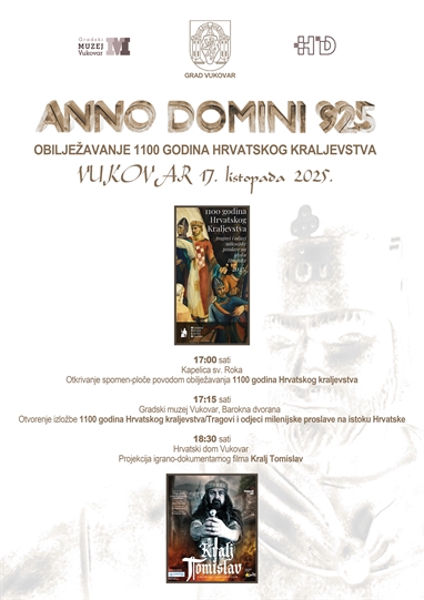 Grad Vukovar, Gradski muzej Vukovar i Hrvatski dom Vukovar, imaju osobitu čast i zadovoljstvo pozvati Vas na svečano obilježavanje velikog jubileja ANNO DOMINI 925Obilježavanje 1100 godina Hrvatskog kraljevstva koje će se održati u Vukovaru, u petak, 17. listopada 2025. godine. Program svečanosti:17:00 sati – Kapelica sv. RokaSvečano otkrivanje spomen-ploče povodom obilježavanja1100 godina Hrvatskog kraljevstva17:15 sati – Gradski muzej Vukovar, Barokna dvoranaOtvorenje izložbe„1100 godina Hrvatskog kraljevstva / Tragovi i odjeci milenijske proslave na istoku Hrvatske“18:30 sati – Hrvatski dom VukovarProjekcija igrano-dokumentarnog filma„Kralj Tomislav“Radujemo se Vašem dolasku i zajedničkom obilježavanju ovoga značajnog povijesnog jubileja hrvatske državnosti.
