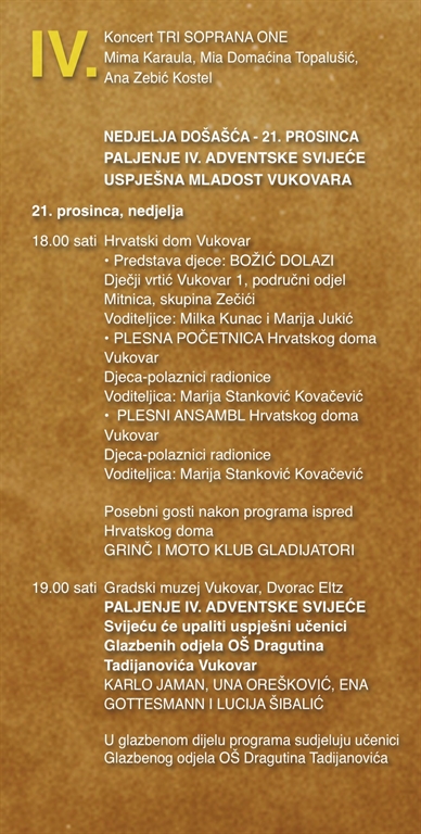 U sklopu XXVIII. Vukovarskih adventskih svečanosti, pozivamo vas na svečano paljenje IV. adventske svijeće, znaka nade, ljubavi i iščekivanja Božića.